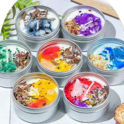 Fragranced Natural Soy Wax Candle in Black Tin with Crystal Stone and Dried Petals (various styles)
