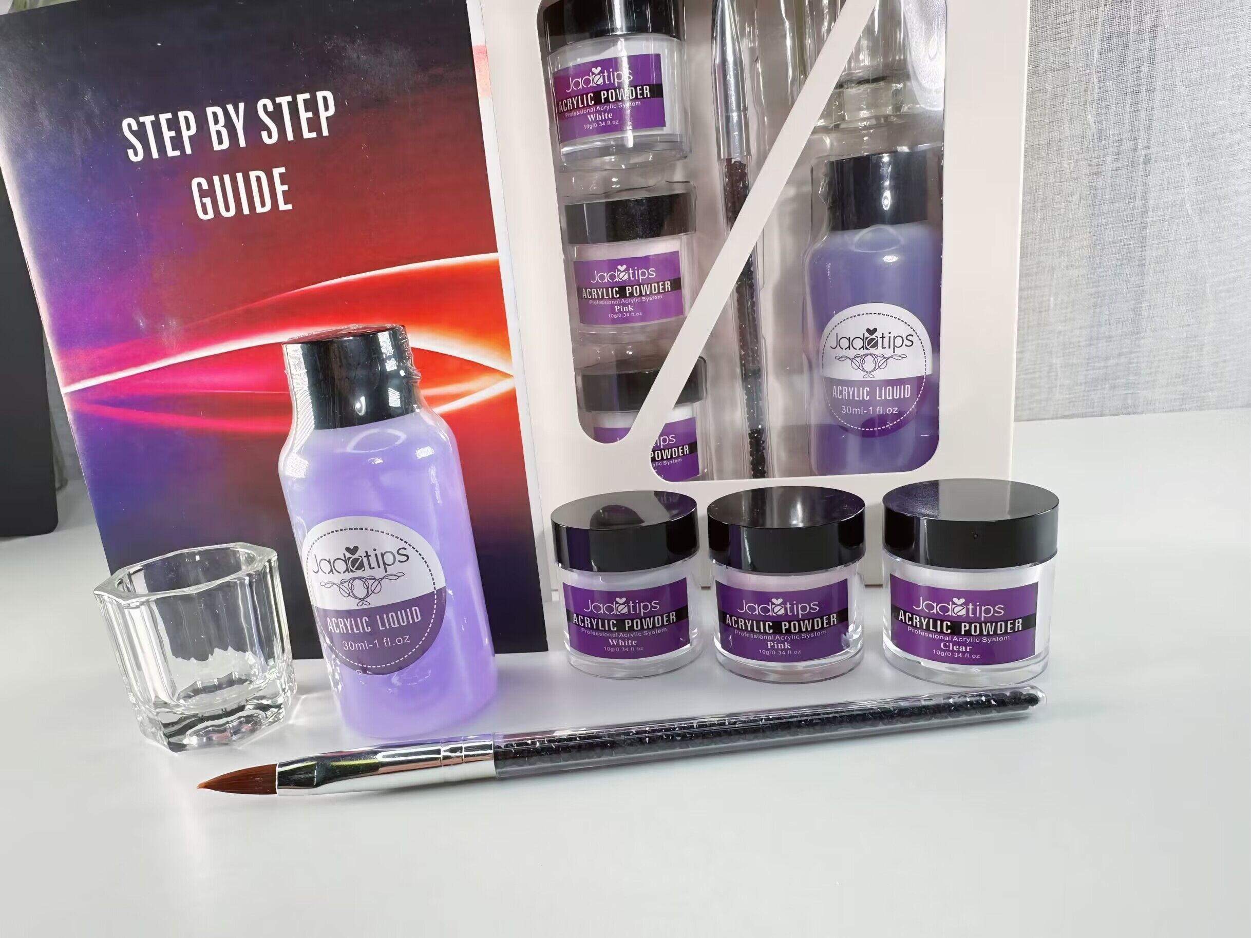 Package contains: 1 x Acrylic Liquid; 3 x Acrylic Powder (White, Pink and Clear); 1 x Clear Glass Dish (the lid in picture might not be included), 1 x Nail Art Brush and Step by Step Guide.