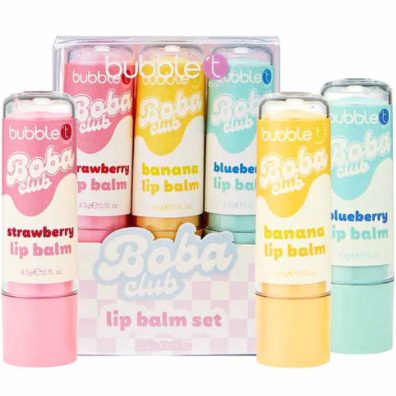 Indulge your lips with the Bubble T Boba Club Lip Balm Gift Set – a playful, tea-inspired trio that delivers hydration and a burst of sweet flavor. Featuring three irresistibly scented lip balms – strawberry, banana, and blueberry – this set is perfect for keeping your lips soft, smooth, and moisturized all day long.