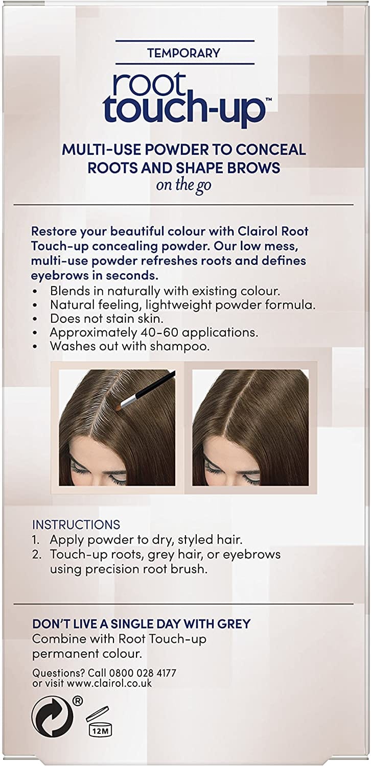 Say goodbye to roots and greys! Our convenient and easy-to-use Temporary Root Touch-Up Concealing Powder covers grey hair on the go and refreshes the rootline colour in a matter of seconds. Clairol Root Touch-Up Hair Dye, Temporary Roots and Eyebrow Powder, Medium Brown blends in naturally with your existing shade, thanks to which you can easily conceal single strands, touch up your temples, boost the colour of your roots or even define your eyebrows. It’s a ideal spot treatment in between colourings that works in the blink of an eye. Keep it in your purse for a radiant and intense hair colour wherever and whenever you go.
