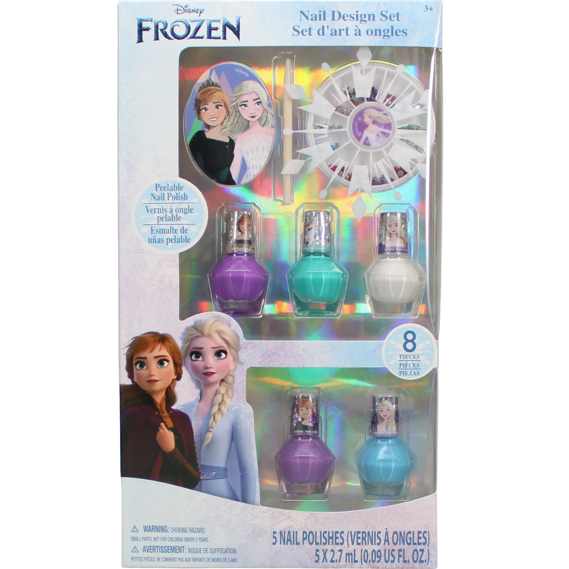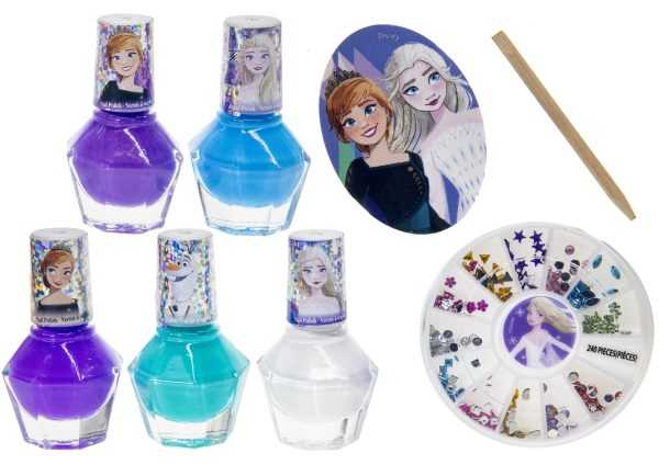 SET INCLUDES: 5 peelable, non-toxic, shimmery nail polishes. 1 Frozen nail file. 1 cutitlce stick. 1 nail gem wheel.