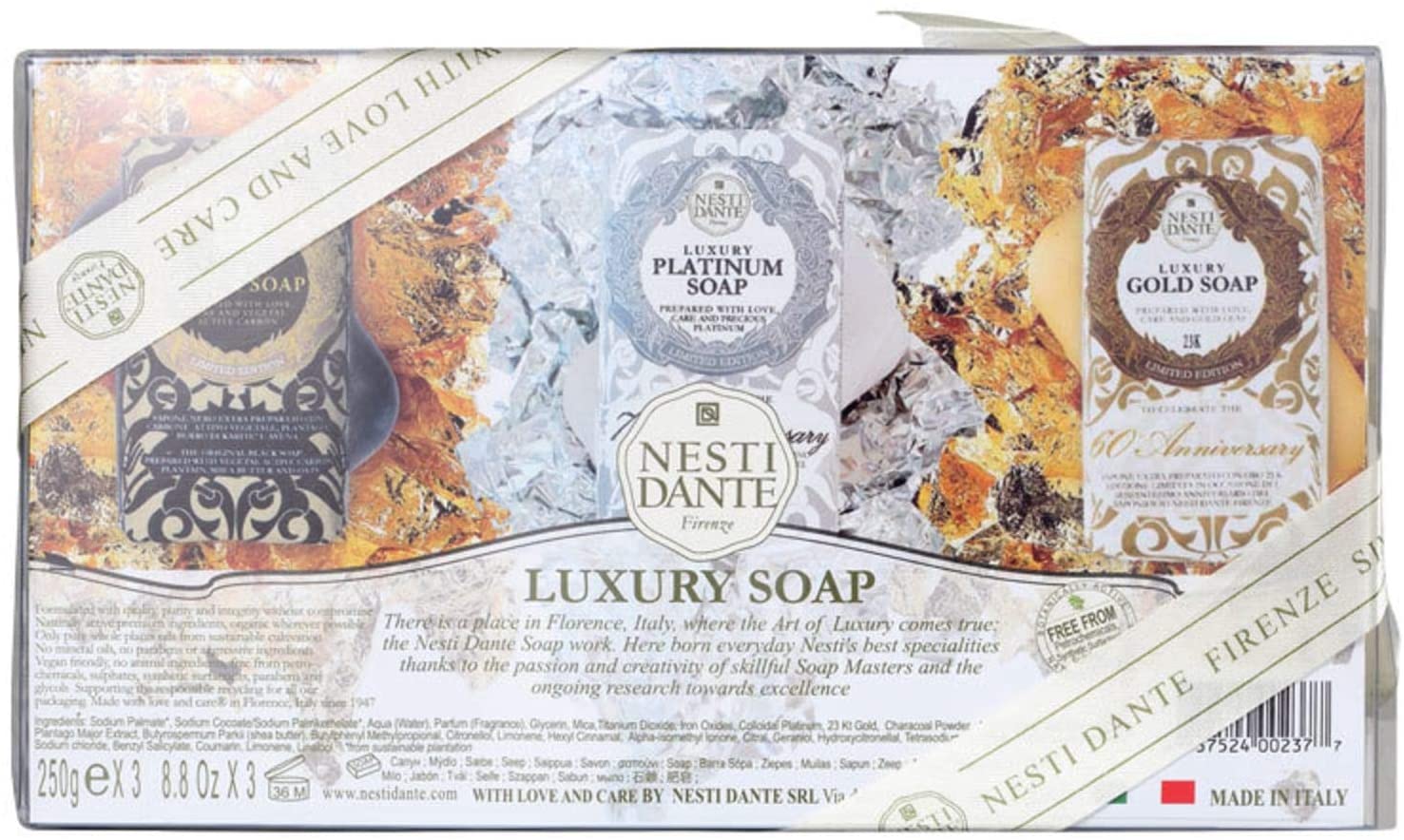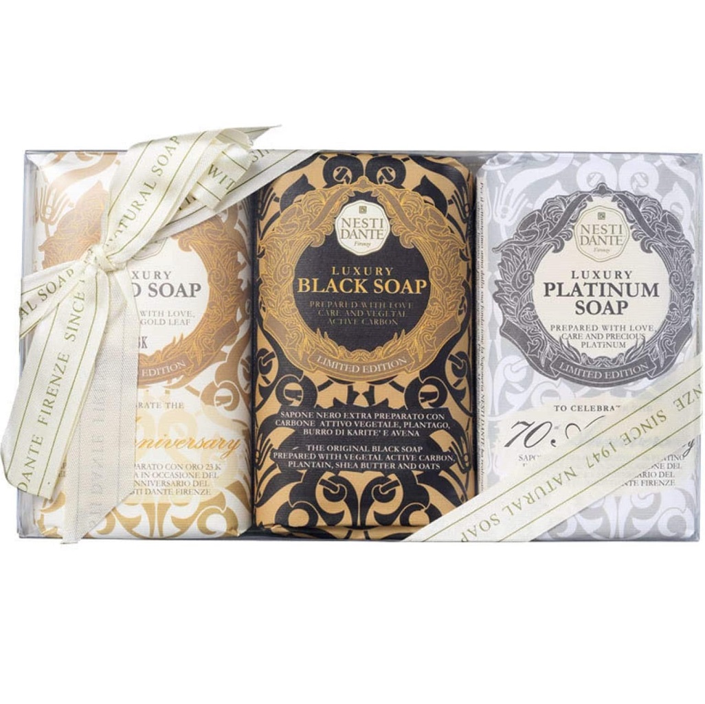 A collection of luxury soaps to cleanse and detox your skin. Set includes: – Luxury Black Soap: This soap contains activated vegetable carbon which helps to absorb, detox and cleanse the skin. It helps to promote cell renewal while shea butter fights the signs of ageing. This soap also contains patchouli, pink pepper, hyacinth and jasmine for a gorgeous scent. – Luxury Platinum Soap: Helping with perspiration, this soap guarantees a clean feel and a fresh scent. it leaves skin feeling smooth and scented with Camelia Bella from Florence. – Luxury Gold Soap: Created with 23-carat gold leaf, this luxury soap contains an intense note of iris nobile to leave skin clean and smelling beautiful. Nesti Dante uses naturally active premium ingredients and only pure whole plant oils that are from sustainable cultivation. No mineral oils, no parabens or aggressive ingredients. Vegan-friendly, no animal ingredients or testing ever. Skin and environment-friendly for a guilt-free legacy.