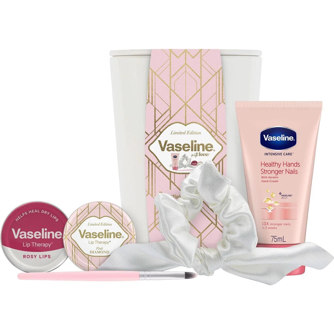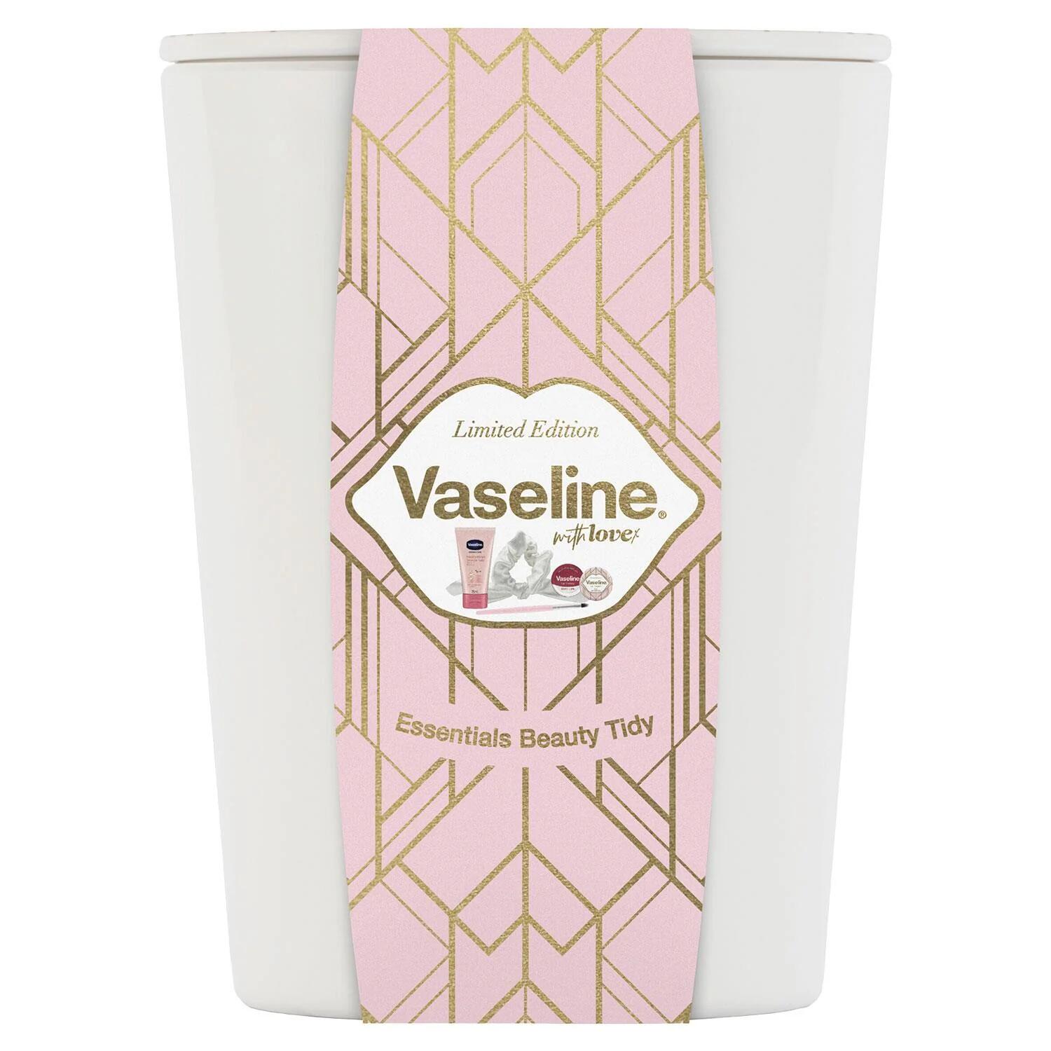 - Vaseline Limited Edition Essentials Beauty Tidy Gift Set features three full-size Vaseline products, plus a hair scrunchie and lip brush, all tucked in a Vaseline Beauty Tidy